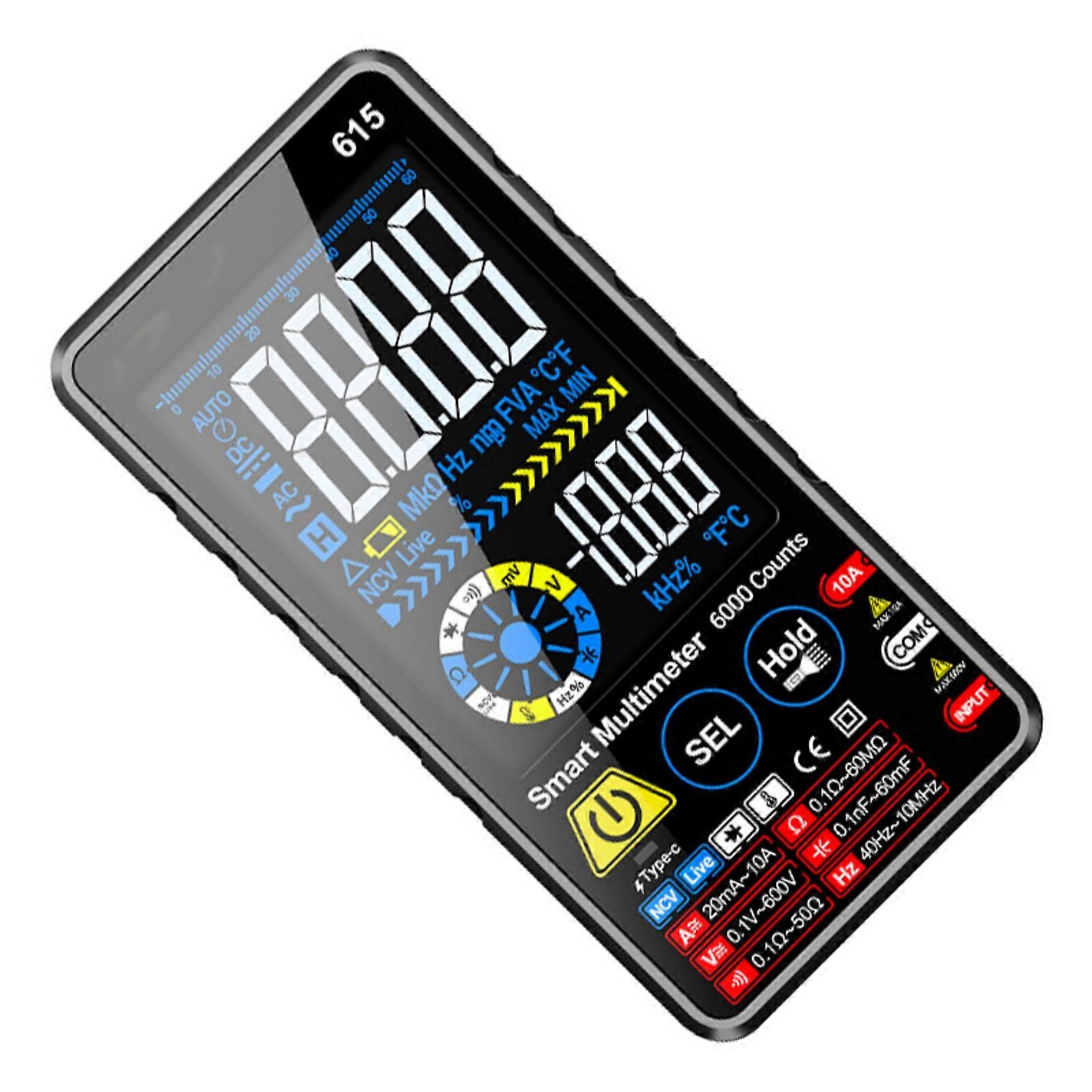 Features: The digital multimeter features double touchscreens with 6000 count resolution, delivering realtime measurement readings for seamlessly ranging switching and backlight activation. Featuring a lightweight and compacts build, this multimeter ensures easy portability; its high precise measurement provide clear readings with automatic ranging selection for user friendly operation. Suitable for home circuit diagnostics, laboratory research, on site equipment maintenance, and educational training environment. Tackle complex electrical tasks confidently from troubleshooting 220V circuits to testing delicate component with its auto ranging capability and dust/water resistance. Engineered with shock absorbing ABS housing and portable design, it integrates Type C charging and organized storage solution for all day reliability in harsh environment. Specifications: Component:ABS Color:Black Size:Approx.138x68.5x16.5mm Weight: 270g Maximumly display: 5999 Charging method: type c Capacitance: 0nf-60mf Resistance: 0Ω-60MΩ Frequency: 0Hz-60MHz Package Includes: 1 Set Digital Multimeter note: 1.Please allow 1-2cm errors due to manual measurement, make sure that you donot mind befores you order. 2.Due to the differences between different monitors, the picture may not reflect the actual coloring of the item. Thanks for your understandings.