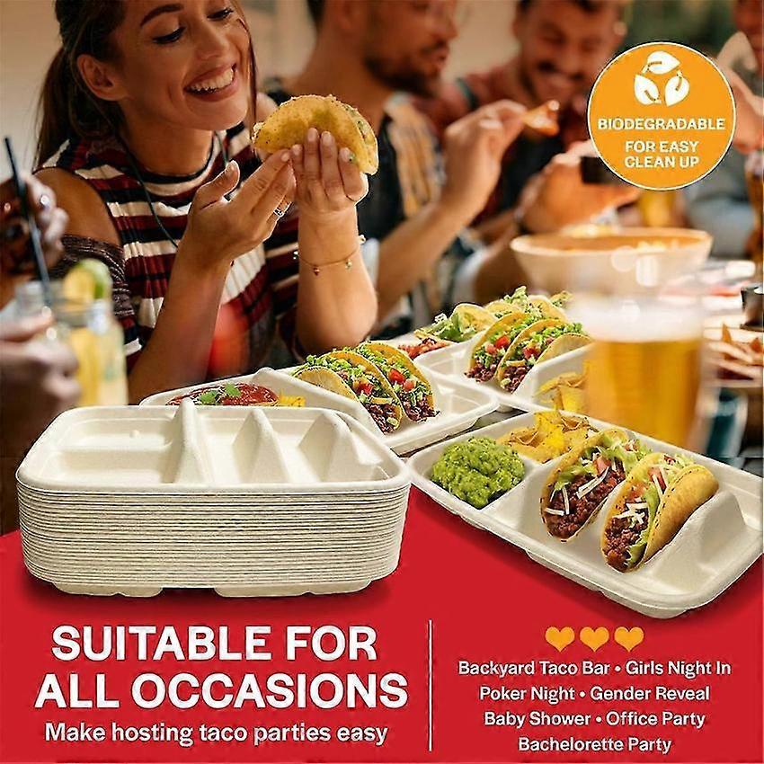 Disposable Taco Plates 25 Pack with Dividers for 2 Tacos and 2 Sides