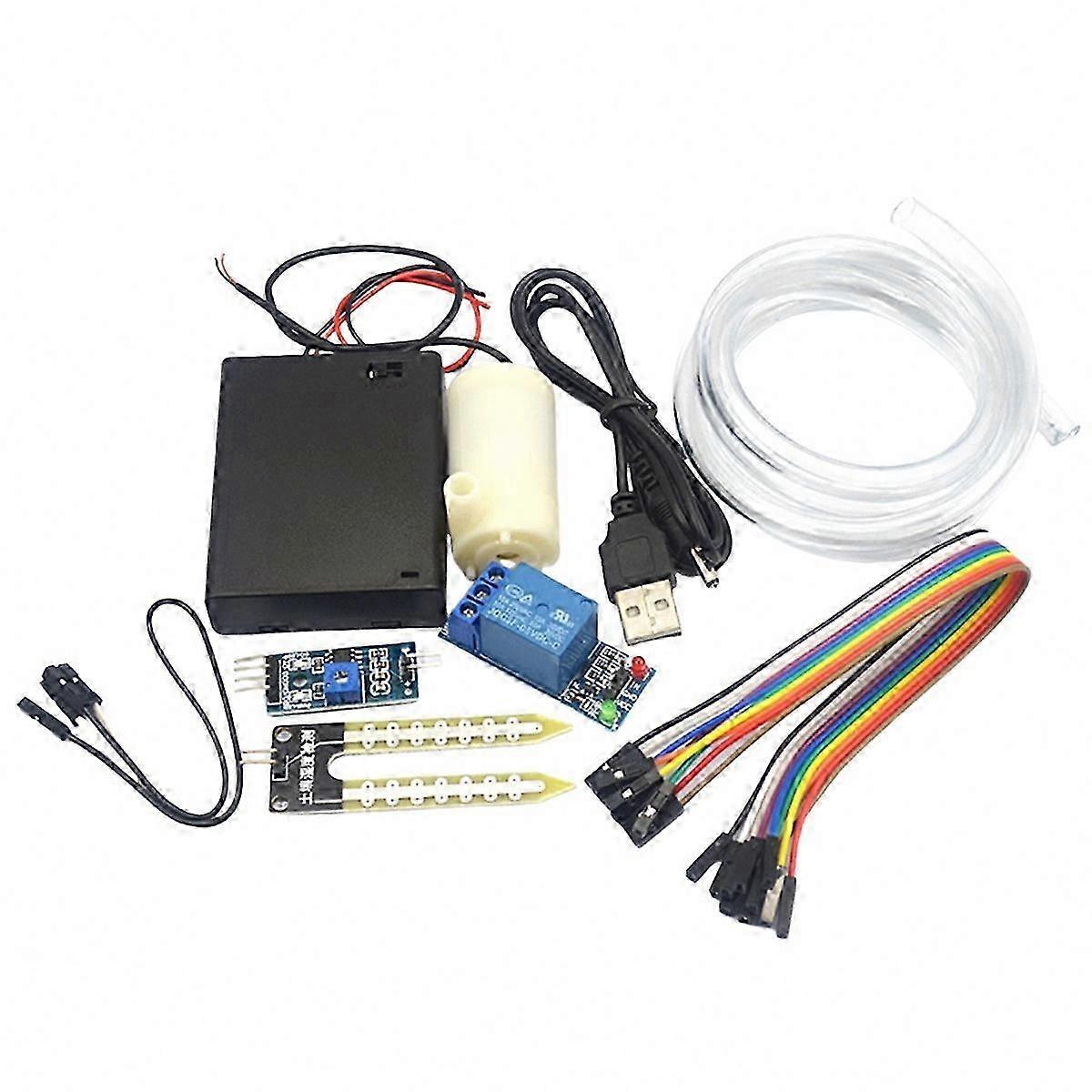 1. Test the relay module: Connect the VCC pin to 5V, GND to ground, and IN to ground — the relay will activate. If the IN pin is left unconnected, the relay will deactivate. Repeating this action will produce an audible click sound. 2. Test the soil moisture sensor module: Connect the fork probe to the sensor module using two Dupont wires. Power the sensor module by connecting VCC to 5V and GND to ground. When powered, the red power LED remains on; the green (or blue) indicator LED flashes faintly once. Insert the fork probe into water — the green (or blue) indicator LED will illuminate. 3. Connect the red wire of the water pump to 5V and the black wire to ground to operate the pump. Note: Operation should be limited to 1 second during testing. Do not run the pump dry for extended periods. Appearance, color, and printed markings may vary slightly between batches, but functionality remains unaffected. Material: PCB Color: As shown Package Contents: 1 x Relay module 1 x Soil moisture sensor 1 x Small water pump 1 x Battery box 1 x USB power cable 1 x 50 cm silicone hose 10 x Dupont cables This package includes only the items listed above. Note: Screen settings and lighting conditions may cause slight color variation between the image and the actual product. Measurement tolerance: ±1–3 cm.