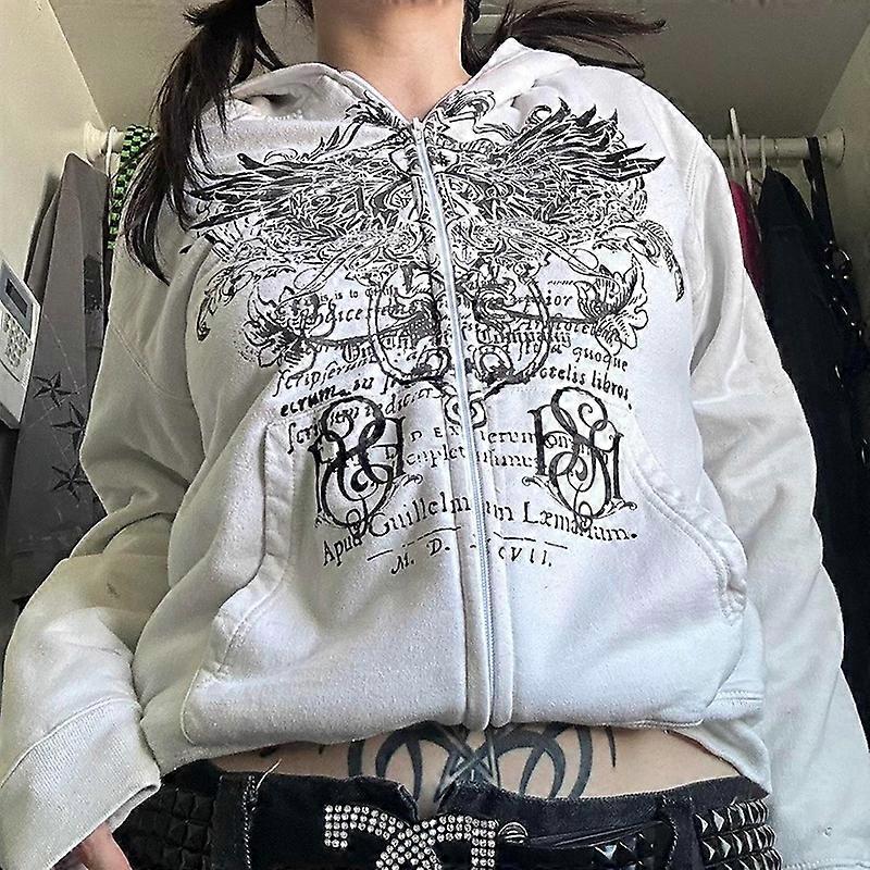 E-girl Gothic Harajuku Mall Goth Hoodies 2000s Y2K Cyber Grunge Emo Zip Up Sweatshirts Vintage Graphics Print Coat Streetwear
