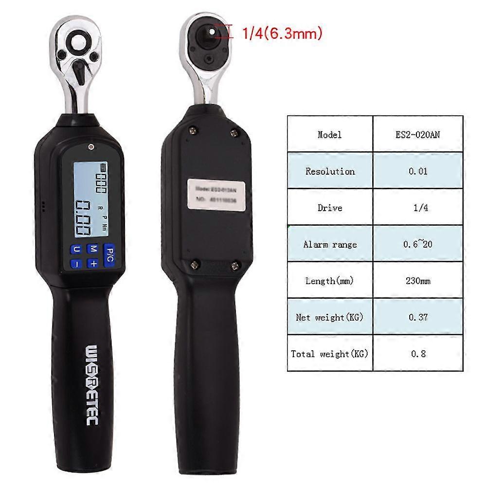ES2-020AN 1/4 Inch Handheld Portable Digital Torque Wrench Large Screen with Backlight Sound LED Alarm Real-time Peaks Measurement Four Units Switchin