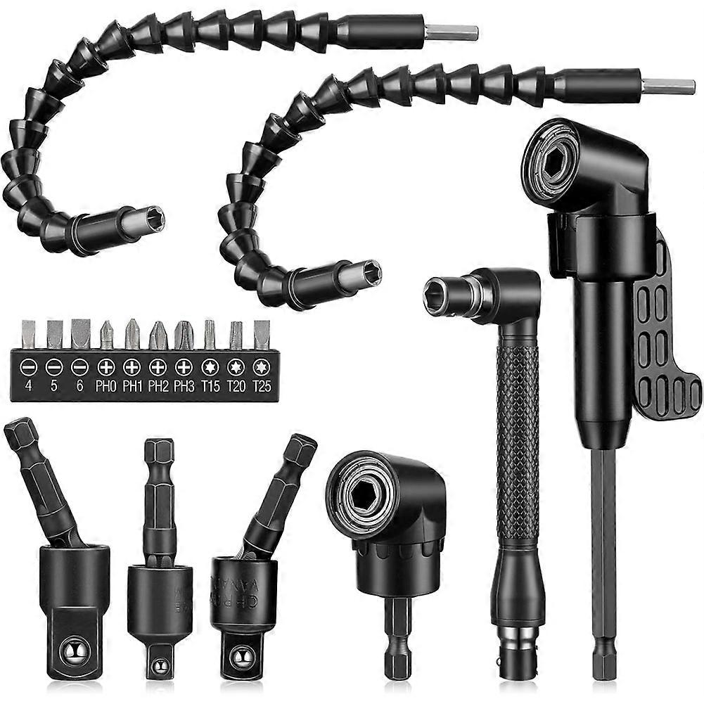 Comprehensive Toolkit: This set includes 1 L-shaped double-ended socket wrench, 2 flexible drill bit extensions, 2 right angle drill extensions (105° angle, in both long and short versions), 3 rotatable joint swivel sockets (1/4", 3/8", 1/2"), and 10 precision screwdriver bits. It's a complete collection for versatile use in tight spaces. Versatile Socket Adapters: Featuring 360-degree rotation, the included socket adapters fit 1/4", 3/8", and 1/2" drives and come with a 1/4" hex drill bit. Ideal for use with power screwdrivers, manual screwdrivers, and other hex tools, these adapters accommodate a wide range of fastener sizes, from 1/4 to 3/4" and 7 to 19 mm. Ergonomic L-Shaped Wrench: Crafted for comfort and efficiency, the L-shaped wrench features dual 6.35 mm (1/4") heads, compatible with various screwdriver bits. Its uniquely shaped handle provides a non-slip grip, enhancing stability during use. The entire kit boasts high durability with its robust steel construction. Flexible Extensions for Hard-to-Reach Areas: Enhance your drilling capabilities with our lightweight, flexible extensions. Designed to twist and rotate at multiple angles, these extensions connect seamlessly to drills and wrenches, allowing access to confined spaces and ensuring precision in awkward angles. Portable and Practical: Ideal for light drilling and detailed screwdriving tasks, this compact, easy-to-carry kit is perfect for home use, automotive maintenance, and other everyday applications. Its versatility makes it a valuable addition to any DIY enthusiast's or professional's toolbox. Color: Black Material: Metal Package Contents: 1*L-shaped double-ended socket wrench 2*Flexible drill bit extension 2*Right angle drill bit extension 3*Socket 10*Short screwdriver bit