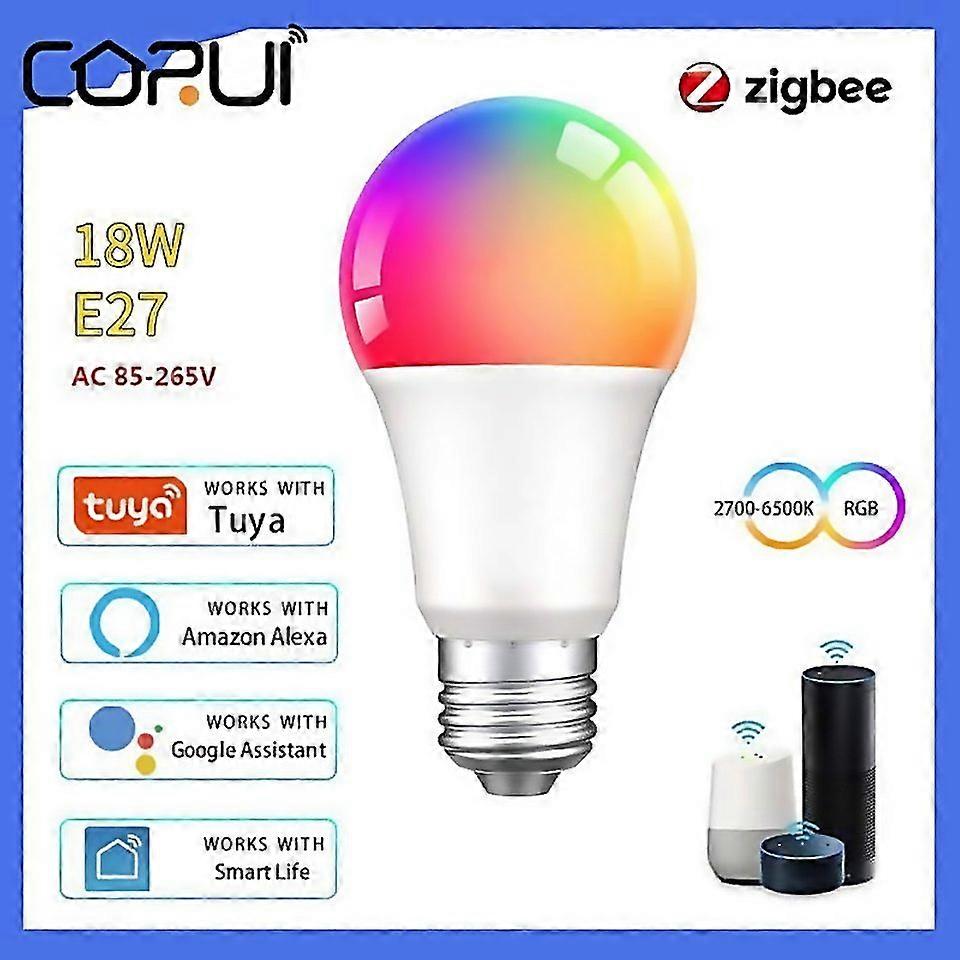 Fangrui Product Details 1. Corui Zigbee3.0 Smart Light Bulb Tuya Bulb Rgbcw 18w Color Changing Led Light E27 Smart Life App Compatible Alexa Google Home 2. Description: 3. Support For H*ue/tuya/smartthings/echo Plus/echo Show(2nd) And Other Zigbee 3.0 Standard Gateway. 4. Support For Tuya, Smart Life App Control. 5. Directly Paired Fast With Echo And Google Home Assistant. 6. Smart Voice Control. 7. Rgbcw.it Can Adjust Various Colors And Brightness. 2700-6500k Color Temperature, Warm White, Cold White Arbitrary Adjustment, Rgb Can Mix A Variety Of Colors. 8. Energy Saving And Life-span:18w 1500 Lm Smart Bulb With E27 Base, Equivalent To 120w Traditional Incandescent Bulbs. Saves Up To Energy, Last Longer And Energy Saver. 9. Specifications: 10. Standard: E27 11. Material: Aviation Aluminum, Plastic 12. Input Voltageac 85-250v 50/60hz 13. Light Color: Rgb Warm White White (2700k-6500k) 14. Power: 12w/15w/18w 15. Color Temperature: 2700-6500k 16. Luminous Flux: 1000lm/1200lm/1500lm 17. Color Rendering Index (cri)> = 80 18. Network:2.4ghz Wi-fi 19. Wireless Standard: Zigbee 3.0 20. Life: >50000h 21. Beam Angle: 270 Degrees 22. Weight: 82g 23. Product Size: 114*60mm 24. Package Included: 25. 1x Zigbee Smart E27 Led Bulb 26. 1x User Manual 27. Notes: 28. Notice: 29. Please Be Clear Before Purchase, This Product Needs To Be Used With A Zigbee3.0 Gateway