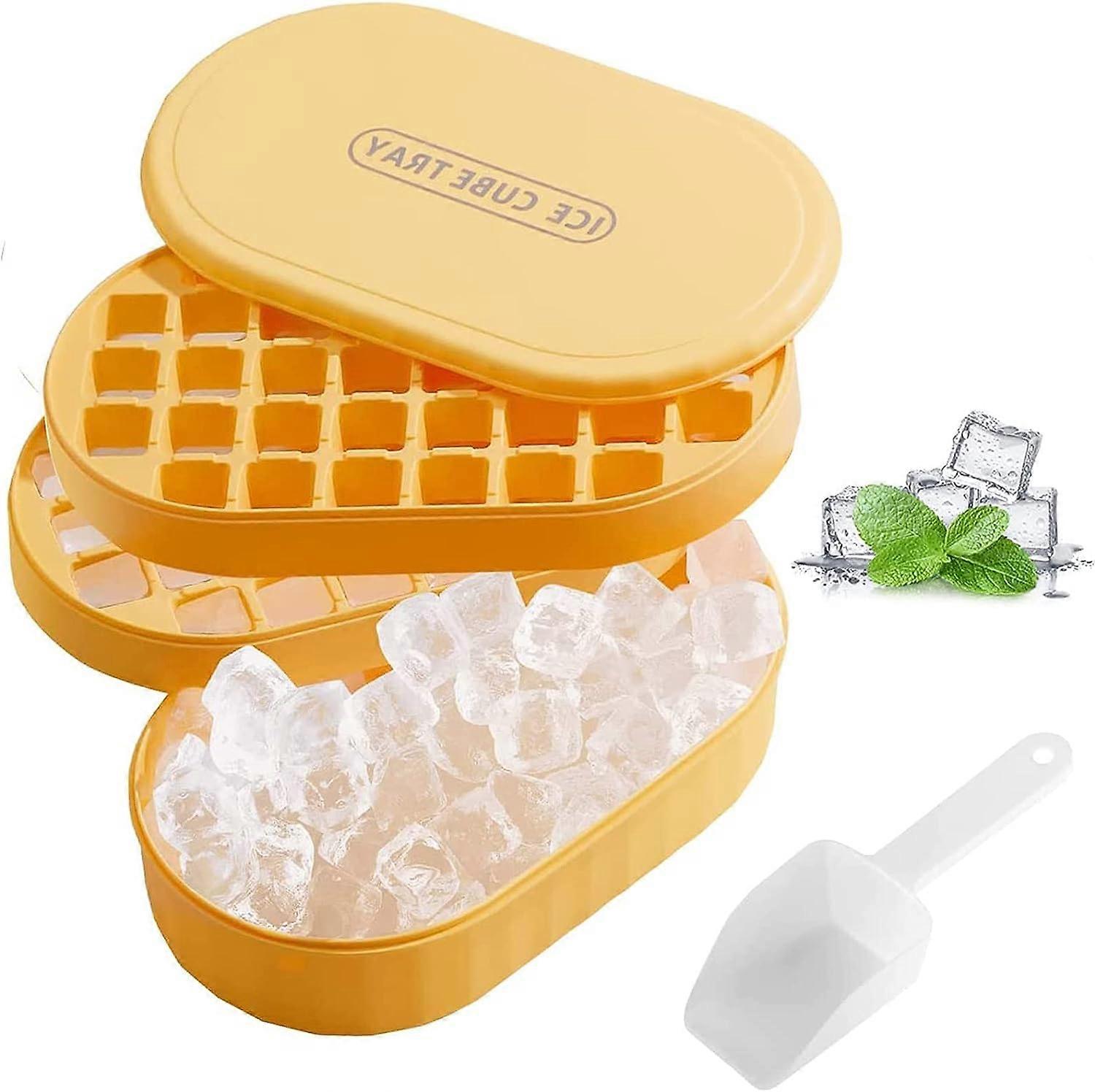 Product size: length 22cm, height 10cm; small ice cube grid height 2cm, width 2cm4 in 1 ice cube tray setIncludes a large capacity double-layer ice cube mold, which can make 72 ice cubes at a time, and the ice storage container at the bottom allows you to store and make more ice cubes. Ice cubes. The lid keeps the ice cubes fresh and hygienic. It is also equipped with an ice scoop, convenient and quick to take ice.Food grade materialThe ice cube tray is made of soft silicone, non-toxic and odorless, can be in direct contact with food, safe for use. The lid and ice storage bin are made of PP material, which is BPA free, not easy to break and durable.Easy Retrieval of Ice Cubes Flexible non-stick silicone material and independent ice cube tray design, you can easily take out the ice cubes. Squeeze the bottom to easily remove ice cubes without bending or twisting them.Get OrganizedThese ice cube molds with lids allow you to make more ice cubes easily, and the stackable design keeps your fridge space neat and organized, saving you time and space. Bright yellow adds more fun.WIDELY USEDIce cubes are an essential part of our daily life, you can add them to juices, smoothies, whiskey, cocktails, beverages and coffee to enjoy refreshing drinks. You can also put fruit, jelly, yogurt, chocolate and milk into the molds to make different flavor ice cubes, perfect for home, picnics, parties and bars.