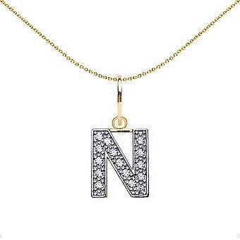 Jewelco London صلبة 9 قيراط من الذهب الأصفر والأبيض المكعب زركونيا 10 مم سان سيريف كتلة الخط قلادة السحر الأولي ، الحرف N