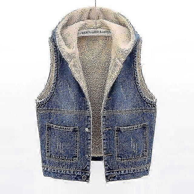Jwl-solid Color Hooded Faux Cashmere Denim Vest Women Autumn Winterr Fleece Liner Warm Waistcoat Casual Loose Jean Sleeveless Jackets