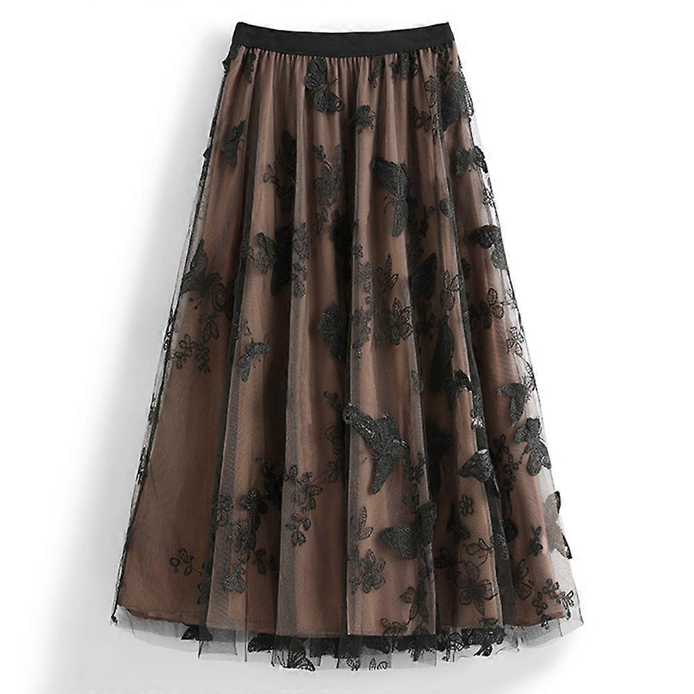 JWL-Butterfly Embroidery Skirt Women High Waist Skirt Elegant Tullee A Line Pleated Skirt Female Mesh Midi Skirt Summer Saia Feminina