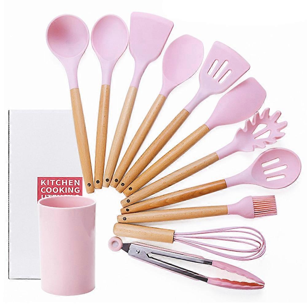 kn073 12Pcs Silicone Cooking Utensils Set with Wood Handle Kitchen Utensils with Storage Bucket (BPA-Free / FDA Certification)