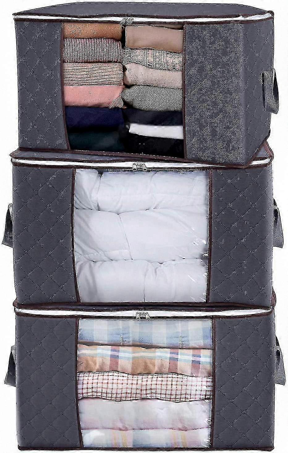 ReinforcedhandleThehandlefeaturestwolayersofthickfabric,effectivelydoublingitsloadbearingcapacity.Reinforcedstitchinghasalsobeenaddedtoenhancestrength.LargecapacityEachstoragebagmeasures23.6x16.9x13.7inches60x43x35cmandoffersagenerouscapacityof90liters.Thespaciousinteriorcanholdyourquilt,blanket,pillow,plushtoy,jacket,orotherclothingitems.HighqualitymaterialsThestorageboxiscraftedfrompremium,odorlessthreelayercompositenonwovenfabric,allowingforventilationandprotectionofyourstoredbelongings.SturdyzipperEquippedwithastainlesssteelzipperthatisresistanttobreaking,ensuringalongerlifespan.Thetwowayzipperallowsforeasyslidingalongtheclosureduringuse,regardlessofhowfullthebagis.VersatilityThisstoragebagsetissuitableforuseinwardrobesorcloakrooms,makingthemanidealchoiceforuniversitydorms,lofts,andbedrooms.Theyaresimplefabricbagswithoutanymetalsupportinside,easilyfoldingintodrawersorcabinetsforspacesavingefficiency.ProductThedesignedcapacityofeachstoragebagis90L.With3packsincluded,theycanholdquilts,blankets,pillows,plushtoys,jackets,orotherclothingsimultaneouslywithoutbeingcramped.Asinglestoragebagcanaccommodate1extralargequilt,or6blankets,or35piecesofclothing.Withsuchaspaciouscapacity,storingmostitemsbecomeseffortlessandorganized.QualitymaterialsThestorageboxisconstructedfromhighgrade,odorlessthreelayercompositenonwovenfabricthatfacilitatesventilationandsafeguardsyourstoreditems.Thehandleismadewithdoublelayerandthreelayernonwovenfabric,effectivelydoublingtheloadcapacity.Reinforcedseamshavealsobeenappliedtoincreasedurability.