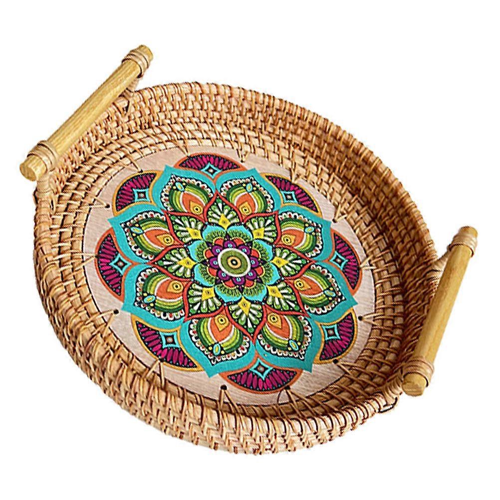 Mandala Pattern Rattan Serving Tray 2Pcs with Handle for Picnic Home Kitchen Brown Square Woven Design Serving