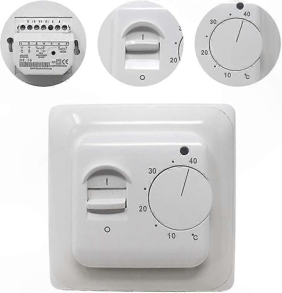 XUEMEI Flush mount, this manual room thermostat is designed to provide automatic on/off control for electric underfloor heating systems and other electrical heating elements. Temperature control range: 5C to 40C. Output: Max 16A. CE certified, safe and easy to use. Turn on the push button and then set the room temperature by turning the rotary knob. When the built-in air sensor detects that the room temperature reaches the preset level, the thermostat will automatically pause the heating. Features a built-in sensor and a 3m NTC external floor probe. The built-in sensor measures room temperature, while the external probe provides floor temperature protection to ensure the floor temperature does not exceed 50C. LED indicator shows when the heating system is active. When the LED is on, heating is in progress.Specifications: Power supply: AC 230V 50/60Hz; Power consumption: 5W; Temperature limit range: 25C to 55C; Degree of protection: IP20.Package includes: 1 x Thermostat, 1 x 3m floor sensor, 2 x Mounting screws, 1 x English user manual.Safe, energy-saving, and high performance. Wall-mounted design allows for easy installation indoors with sufficient air circulation. Avoid placement near heat sources, direct sunlight, drafts from doors or windows, or exterior walls that may affect temperature readings.Easy to use: On/Off push button and rotary knob for precise temperature control. Turn the knob to select desired temperature. LED indicator confirms system operation.Compatible with electric underfloor heating systems and other resistive heating loads. Designed for reliable and efficient temperature management.
