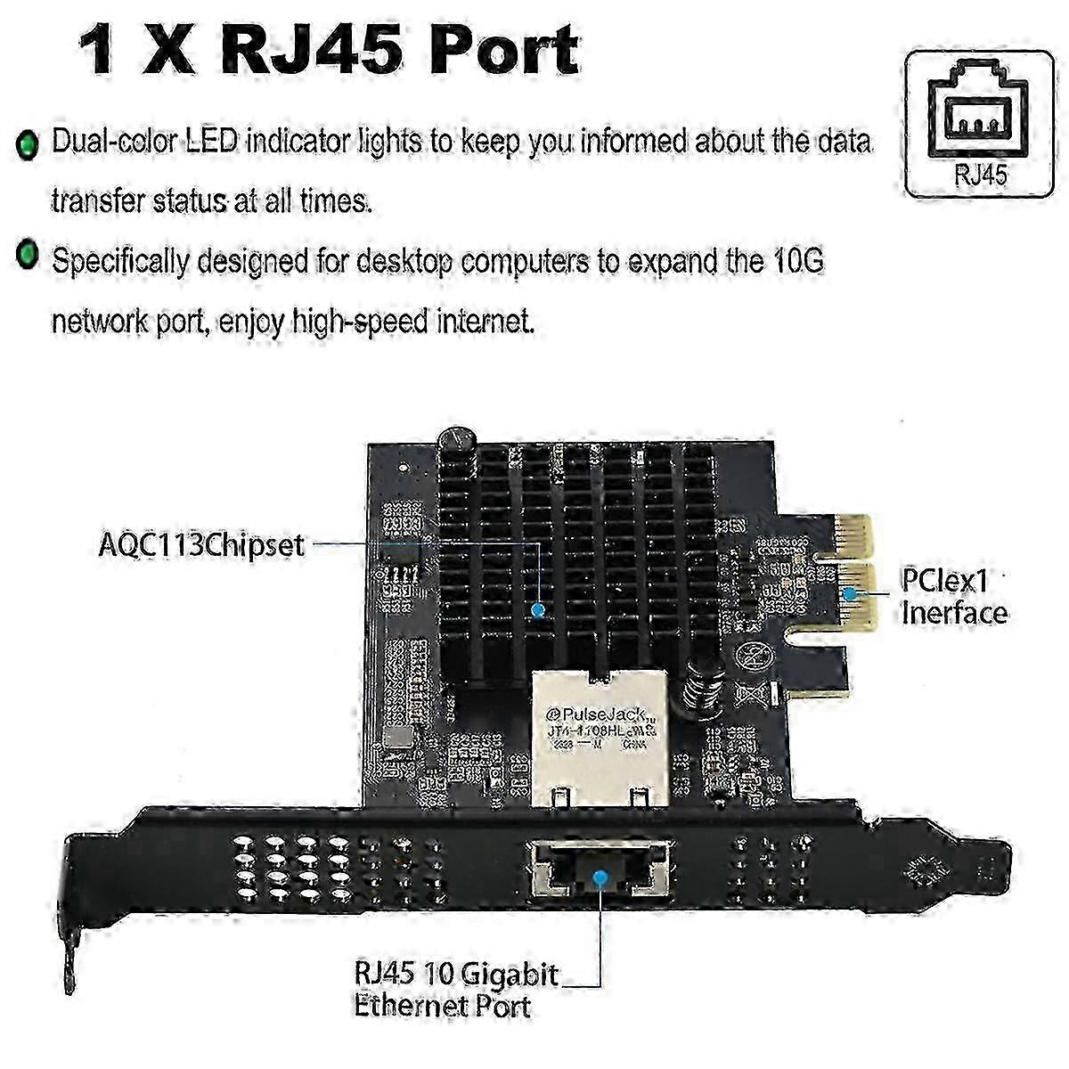 Product name: PClex1 to single-port 10G 10G network card Model: IO-PCE1131- Chip: AQC113 Port type: 1 RJ45 interface Interface type: PClex1 Speed: 10 or 100 or 1000M or 2.5G or 5G or 10G Scope of use: desktop, server, NAS soft router Storage humidity: 90 percent non-condensing relative humidity at 35C Operating temperature: 0C - 85C (-32 F - 185 F) Storage temperature: -55C - 105 (-67 F -221 F) System support: , Linux and other systems Colour:Black Material:ABS Package Contents: 1 x PCIE X1 to 10GBPS single port RJ45 network card 1 x short iron plate Only the above package content, other products are not included. Note: Light reflection and different displays may cause the color of the item in the picture a little different from the real thing. The measurement allowed error is 1-3cm.