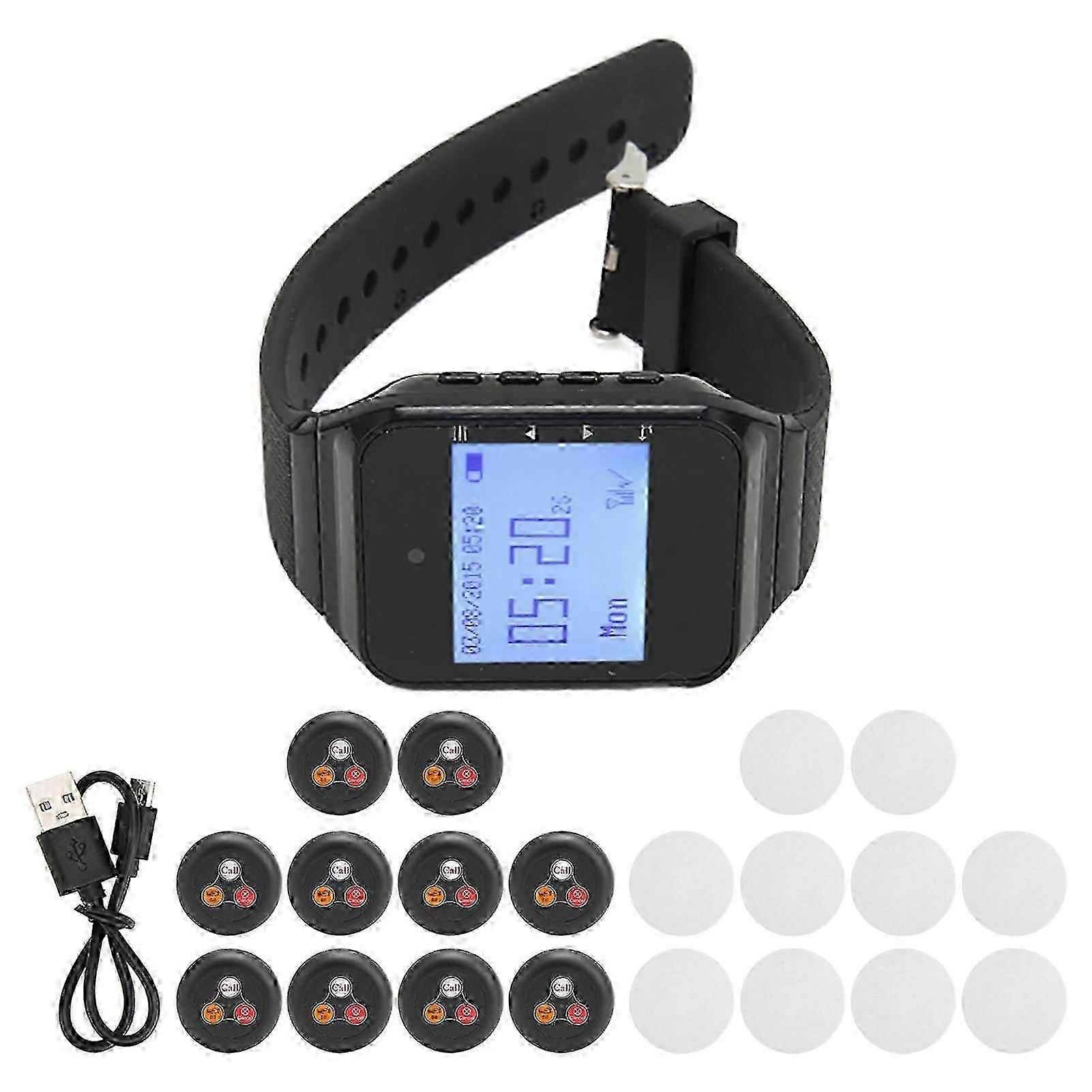 1Stylish Watch: This patient pager system features stylish watch receiver design, radio frequency technology provides stable signal transmission. 210 Buttons: This wireless calling system provides 10 pagers and 1 watch receiver. One watch supports up to 500 pagers. 3Dual Mode: This customers pager system supports accurate time display. Vibration or buzzer prompt mode. 4Detachable Battery: This patient calling system adopts detachable battery, offering long stand by time. Circuit protection for charging ensures high safety. 5Wide Application: This restaurant paging system is perfect for restaurant, nursing home, cafe, supermarket, hotel, hospital ward, emergency center, bank, school, factory, construction site.