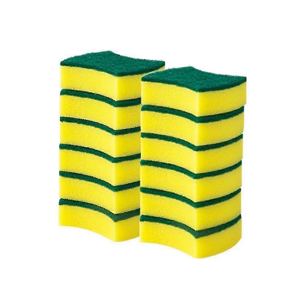 Material: Polyester + Sponge RUGGED PROOF - Consist of 2 layers, green scouring layer and yellow non-scratch cellulose sponge layer. Powerful scrubbing side helps remove stubborn stains, effectively removes stubborn dirt, non-abrasive yellow cellulose sponge removes dirt and particles, can be used with dishwashing liquid if preferred.', LONG TERM DURABLE - Scouring sponges are made to last, they hold shape well and won't unravel or crack easily like regular sponges, and last a long time even when scrubbing hard burnt food. So scrub, wipe and clean with the cleaning sponges with confidence. VERSATILE CLEANING. Perfect for cleaning more than dishes, pots, pans, but also ideal for sinks, stoves, bathroom and any household cleaning kit effectively, keep your kitchen and bathroom sparkling. Comes with a pack of 12, each 6 piece sponges are packed in a bag. ABSORBENT AND STRIKE-FREE - The cellulose side has great absorbency, perfect for cleaning dishes, it easily wipes away dirt and food particles without leave scratches or streaks. AlwPXCL test the scrub side on an inconspicuous area to check for surface damage. Do not use it with an abrasive cleaner. Rinse with water after each use, they dry quickly and do not release odor. One size: 10*8*3 cm Delivery quantity: One piece