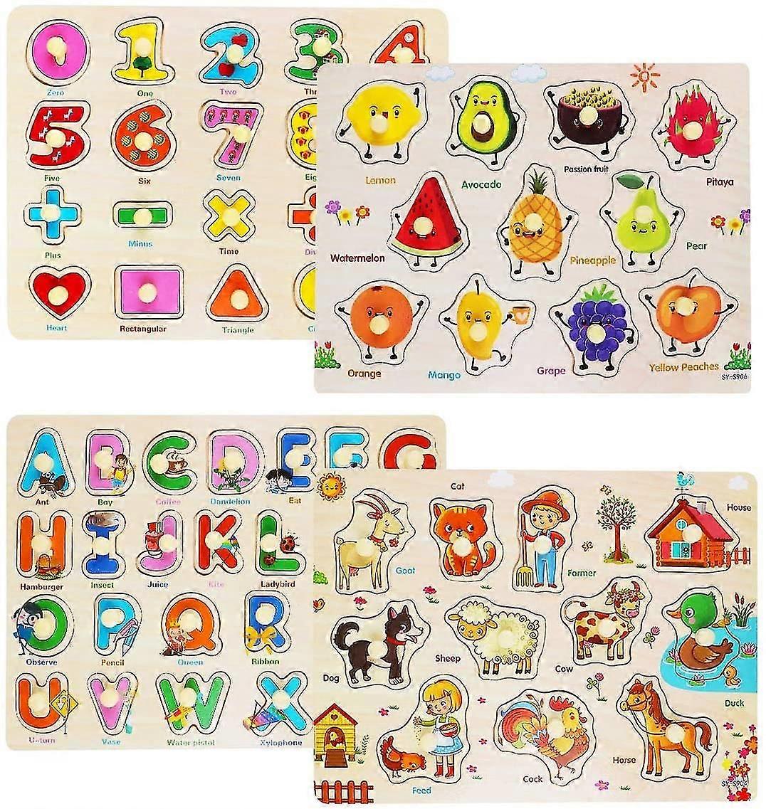 Qucyy 4 Pack Wooden Peg Puzzles For Toddlers Alphabet Number Animal Fruit Puzzles And