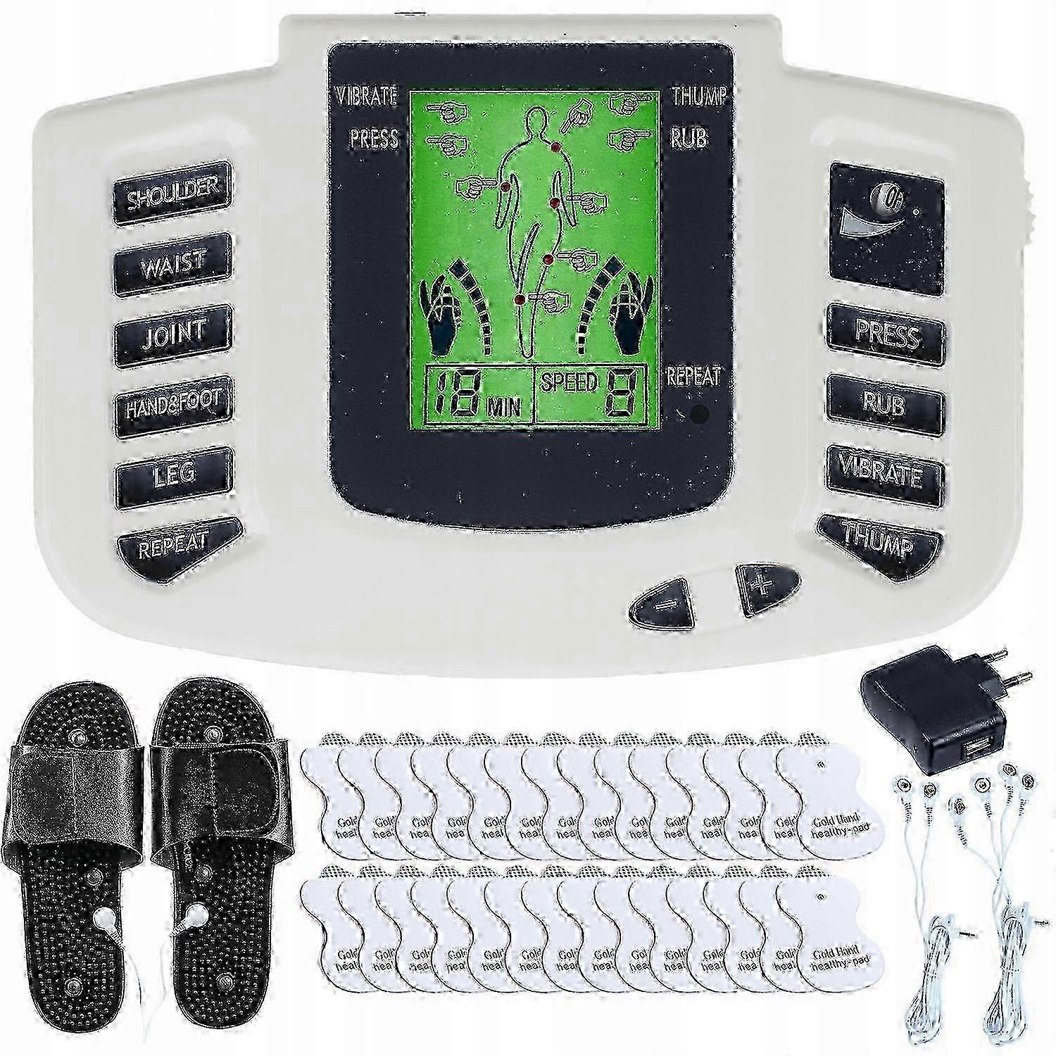 ELECTROSTIMULATOR TENS / EMS 28 ELECTRODES FOR BODY FLAP (ELECTRODES) ONLY WITH US YOU CAN BUY ELECTROSTIMULATOR WITH ADDITIONAL PADS 7x4 pcs TENS and EMS stimulation techniques 9 therapeutic programs speed, power and frequency control connection of 4 electrodes or flaps easy to read large LCD display intuitive operation possibility of setting the treatment time effective in the fight against pain Effective in the treatment of degenerative pains rich set of accessories battery or mains operation legible backlit display high security ETS GERMANY, MOODY and CE CERTIFICATES Polish manual Description The FWL-2000A electrostimulator is the latest device for analgesic therapy and muscle suit strengthening for home use. It helps in everyday pain problems caused by degeneration, neuralgia, rheumatism, migraines as well as mechanical injuries . In addition, it affects the development and regeneration of muscle tissue. A simple control panel and a large display make the use of the device very easy and intuitive. The attached detailed description of the location of the electrodes on the patient's body in various ailments makes the treatment with its use extremely effective and efficient. The technology used in the device is 100 percent safe for the person using the electrostimulator and has been used successfully for many years in medicine. Small dimensions and light weight mean that the device can always be carried with you. You connect up to 4 electrodes for treatments to the FWL-2000A electrostimulator . This has an impact on the effectiveness and much greater effectiveness of the therapy. The electrodes imitate the technique of manual massage. Depending on the arrangement of the electrodes on the body, we obtain the desired effect. Elektrostimulator has 9 work programs, including five types of massage: thermopuncture scratching, rolling, kneading pulsing Fight the pain NATURALLY The use of TENS / EMS electrostimulator is a good alternative to pharmacology, painkillers and anti-inflammatory drugs. It has no side effects. The device stimulates the body's own natural defense mechanisms against pain. It painlessly produces impulses that imitate those naturally occurring in the human body. This creates the effect of the so-called "pain gate" . Application of TENS therapy: back pain arthralgia, neuralgia, with headaches, for post-traumatic pains of the musculoskeletal system, with blood circulation disorders, also in chronic pain conditions of various causes. Application of EMS therapy: muscle training and increasing their endurance, relaxation, relaxation when we feel muscle fatigue, muscle regeneration after exercise. Connections to the FWL-2000A electrostimulator accessories: 4 electrodes a pair of flip-flops FWL-2000A electrostimulator 1. Regulation of the strength of electrostimulation by means of a built-in knob with a graphic scale, 2. Adjusting the speed of stimulation with the buttons (/-) Pictures of the device Powering the device The electrostimulator can be powered by batteries or a power supply . Battery saving The device is equipped with an energy saving system. If you do not use the electrostimulation device for more than 5 seconds , the screen backlight is turned off. Foot stimulation It is not only a massage and relaxation, but also a much-needed detox for your body . Thanks to the flap, which are included in the set, they act as electrodes for the feet, feel like you are using a professional foot massage. The kit includes: 1x FWL-2000A electrostimulator 28x body electrodes - SET (7x4 pcs) 1x connecting cable (4 CLIPS) 1x connecting cable (2 CLIPS) 1x flaps (acting as foot electrodes) 1x 230V AC power adapter 1x cable connecting the power supply via USB 1x cardboard box POLISH user manual Note: Due to the light and screen setting difference, the item's color may be slightly different from the pictures. Please allow slight dimension difference due to different manual measurement. Sold by-Minnanxin