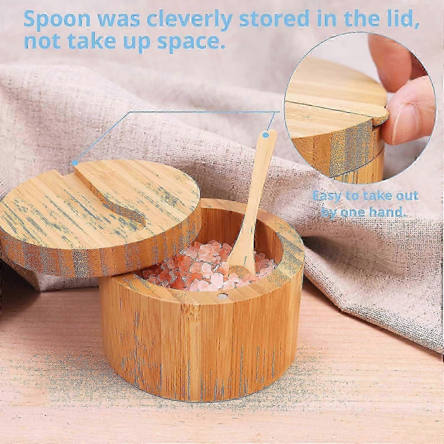 1. Bamboo 2. Salt Box with Twist-Off Lid: The sleek twist-off lid features a magnetic closure that closes securely with a magnetic lock while opening easily with just one hand, making it easy to quickly access spices while cooking. 3. Condiment Storage Container with Spoon: This salt shaker includes a handy bamboo serving spoon, allowing you to sprinkle your spices accurately. The spoon cleverly stores in the lid so it doesn't take up space when you don't need to use it. 4. Functional Storage Jar: Extra-large bamboo spice container for storing salt, pepper, spices, herbs, or seasonings. Keep this extremely practical bamboo salt container within easy reach on your countertop or kitchen table. 5. Natural Bamboo: Bamboo is more environmentally friendly. This versatile, all-natural bamboo salt box is beautifully crafted and looks stylish on your desk. Note: Due to the light and screen setting difference, the item's color may be slightly different from the pictures. Please allow slight dimension difference due to different manual measurement.