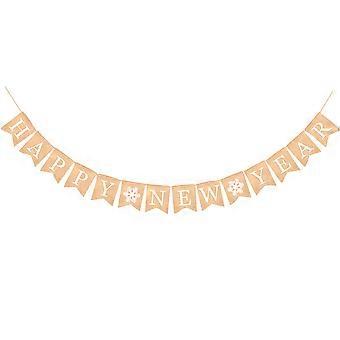 Hyvää uudenvuoden banneri vintage säkkikangas loma bunting party roikkuva seppele vuoden 2020 uudenvuodenaaton juhlafestivaaleille (valkoinen)