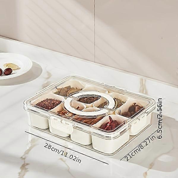 Serving tray with 8 compartments, handle, spacious lid, removable snack box and fruit container for food storage and snack organization