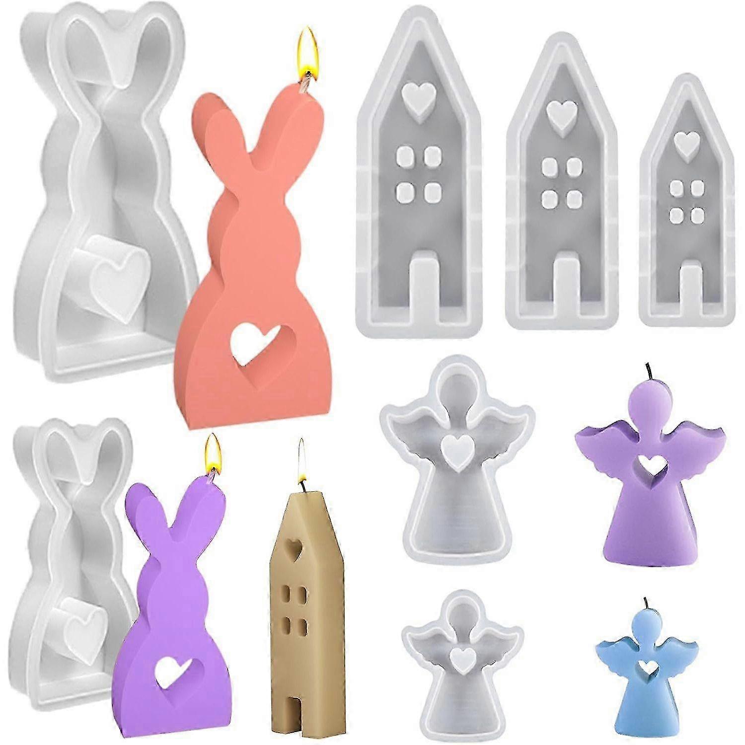 HIGH-QUALITY MATERIAL: Our silicone moulds are made of high-quality silicone material, foldable, flexible, smooth, easy to disassemble, not easily deformed, washable. The moulds are suitable for microwave, oven, refrigerator, freezer and dishwasher, but please do not touch them directly with an open flame or near a heat source. EASY TO USE: It is very easy to use, for example, if you use the mould to make candles, first pierce the bottom of the mould with a needle, insert the wax wick through the bottom of the mould and seal it with wax, then pour in the preferred raw material and hold the raw material until it is fully formed. After moulding, you can open the mould directly to remove the candle. VERSATILE: Our moulds can be used not only to make candles, but also ice cream, soap, polymer clay, small animals and plant specimens. You can also incorporate paints, mica, lacquers and glitter into the resin to create beautiful decorations for your home. MULTIPLE FORMS: The set includes 2 different sizes of hollow heart angel moulds, 2 different sizes of rabbit moulds, 3 different sizes of house moulds. You can use these silicone moulds to make beautiful crafts that can be placed on your coffee table, fireplace, dining table, living room, bedroom, study, bathroom, etc. to add charm to your home decor. IDEAL GIFT CHOICE: You can share the DIY casting moulds with your DIY-loving friends or family members and enjoy the fun of handmade crafts together, or you can give the finished product you have made as a beautiful gift to the person you want.
