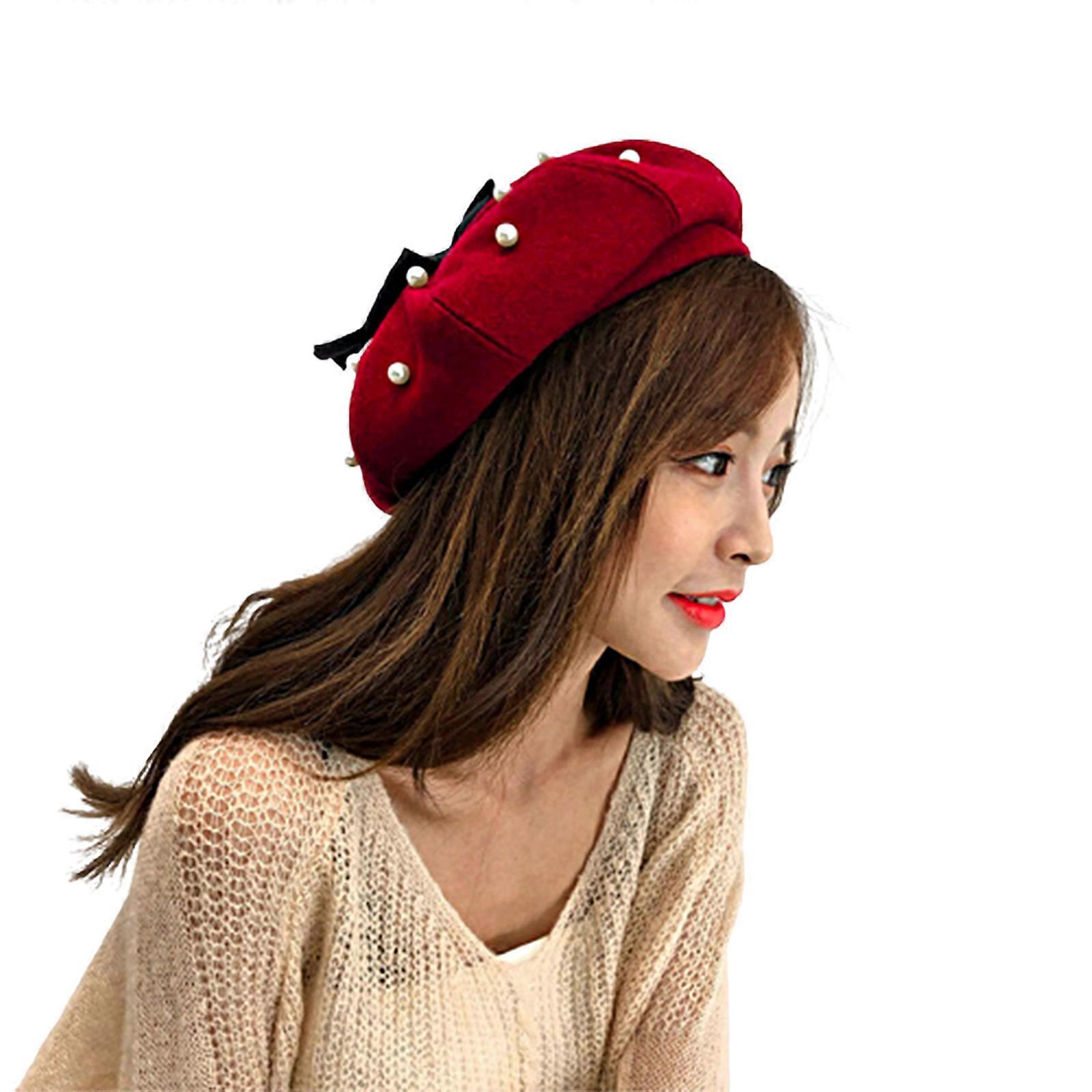 Solid Color Octagonal Cap Pearls Bow Woolen Beret Painter Hat for Halloween Xmas