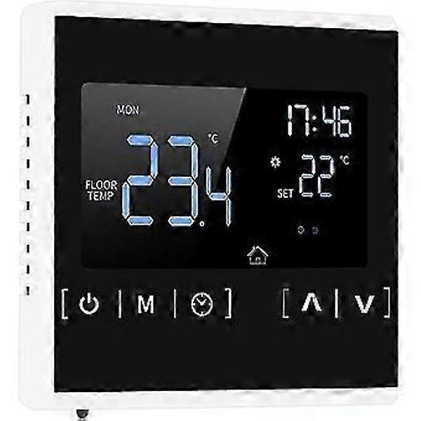 Description Touchscreen thermostat is easy to install and use, adapting effortlessly to your lifestyle. Schedule it according to your routine to save on electricity bills. Features 5+2 day programmable settings with 6 temperature control cycles. In power-off mode, the low-temperature frost protection function automatically activates when the temperature drops below 5°C. If the floor temperature exceeds 7°C, the overheat protection engages. Manual and programmable modes can be selected via an external 3-meter sensor. Offers 6 programmable operating modes to control temperature and time, with hour and minute settings. Description: Color: White Material: Flame-retardant Polycarbonate + ABS. Dimensions: Approx. 86 x 86 x 16 mm. Input Frequency: 60 Hz. Input Voltage: 85-240 VAC. Temperature Sensor: NTC Thermistor. Temperature Control Accuracy: ±1℃ Power Consumption: 1W load Current: 16 A. Button: Touch control. Temperature Adjustment: 5 to 50 °C. Installation Hole Spacing: 60 mm. Measured Items: Room temperature, floor heating temperature.