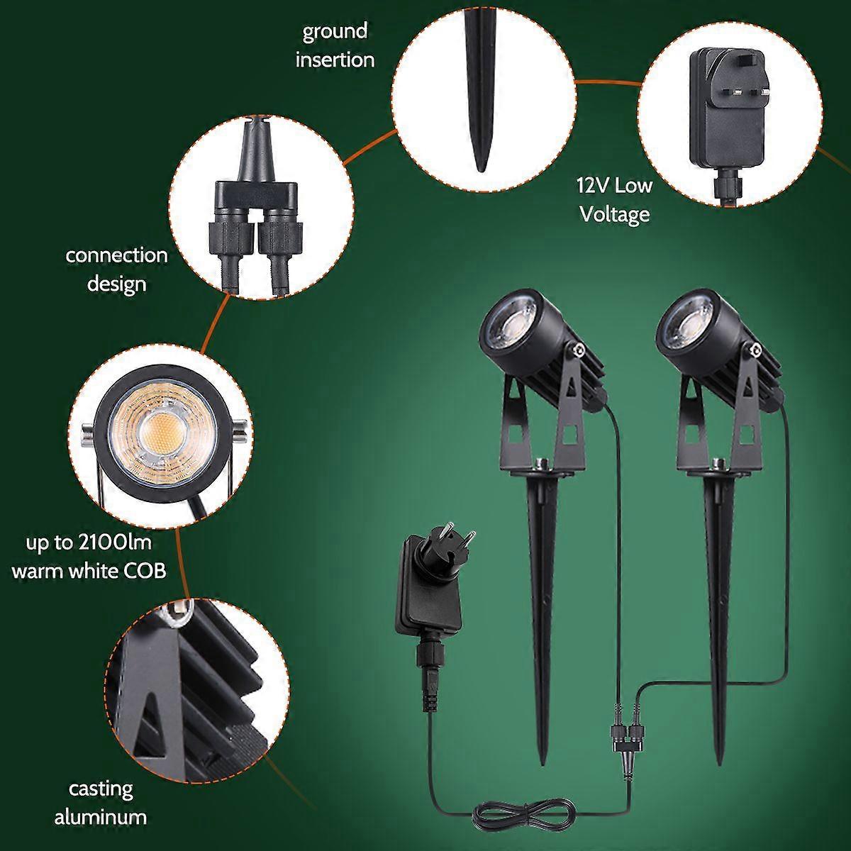 Feature:1. 6-in-1 Landscape Lighting: 6 pack 3W COB landscape lighting, more stable and bright than the standard LED landscape lighting.2. Easy Installation: 6.56ft/2m long between lights with 1.5m/4.9ft long connection cord, more convenient to install and use.3. 12V Low Voltage: Safe operation at 12V low voltage, just need to plug in and insert the light spike stand into the suitable positions to make it work.4. IP65 Protect Rate: IP65 water \u0026 dust resistant rating which greatly improves the stability of outdoor lighting and long-term use. Designed to withstand extreme heat and bitter cold.5. Widely Applicable: Emitting warm white lighting to provide adequate illumination on your pathway, driveway, garden, tree and walls.Specification:6 pack COB LED gardon spotlight, totally up to 2100lm for illuminating your patio, garden path, yard fences-not only for secure but also decorating with beautiful warm white lights.Features:6-in-1 Landscape Lighting: 6 pack 3W COB landscape lighting, more stable and bright than the standard LED landscape lighting.Easy Installation: 6.56ft/2m long between lights with 1.5m/4.9ft long connection cord, more convenient to install and use.12V Low Voltage: Safe operation at 12V low voltage, just need to plug in and insert the light spike stand into the suitable positions to make it work.IP44 Protect Rate: IP44 water & dust resistant rating which greatly improves the stability of outdoor lighting and long-term use. Designed to withstand extreme heat and bitter cold.Widely Applicable: Emitting warm white lighting to provide adequate illumination on your pathway, driveway, garden, tree and walls.Specifications:Material: ABS & aluminumInput: AC 100-240V, 50/60HzOutput: 12V 2AWattage: 20WLight source: 6pcs * COB beadsLuminous flux: 1620-2100lmColor temperature: 3000-3200k warm whiteProtect rate: IP44Working temperature: -25 to 45Lifespan: 50000hCable length: 2m + 5*2mLight size: 42 * 80mm / 1.65 * 3.15inHeight with stake: 250mm / 9.84inPackage weight: 1770g / 3.9lbPackage size: 205 * 138 * 227mm / 8.07 * 5.43 * 8.94inPacking List:6 * Garden Lights1 * L Wrench1 * User ManualPackage List:6 * Garden Lights1 * L Wrench1 * User Manual