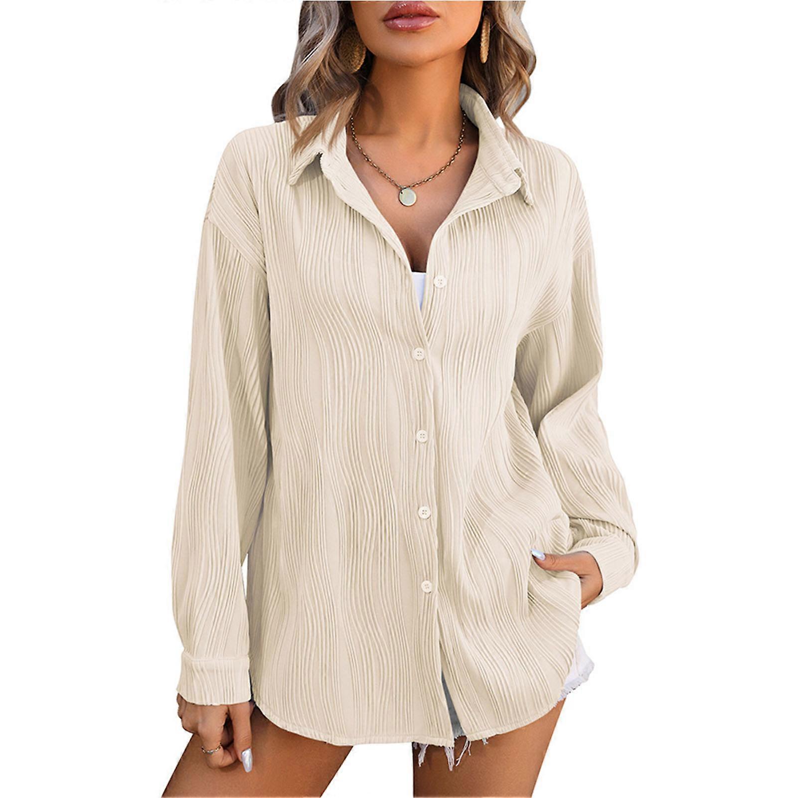 Women Casual Shirt Turn Over V Neck Long Sleeve Apricot M