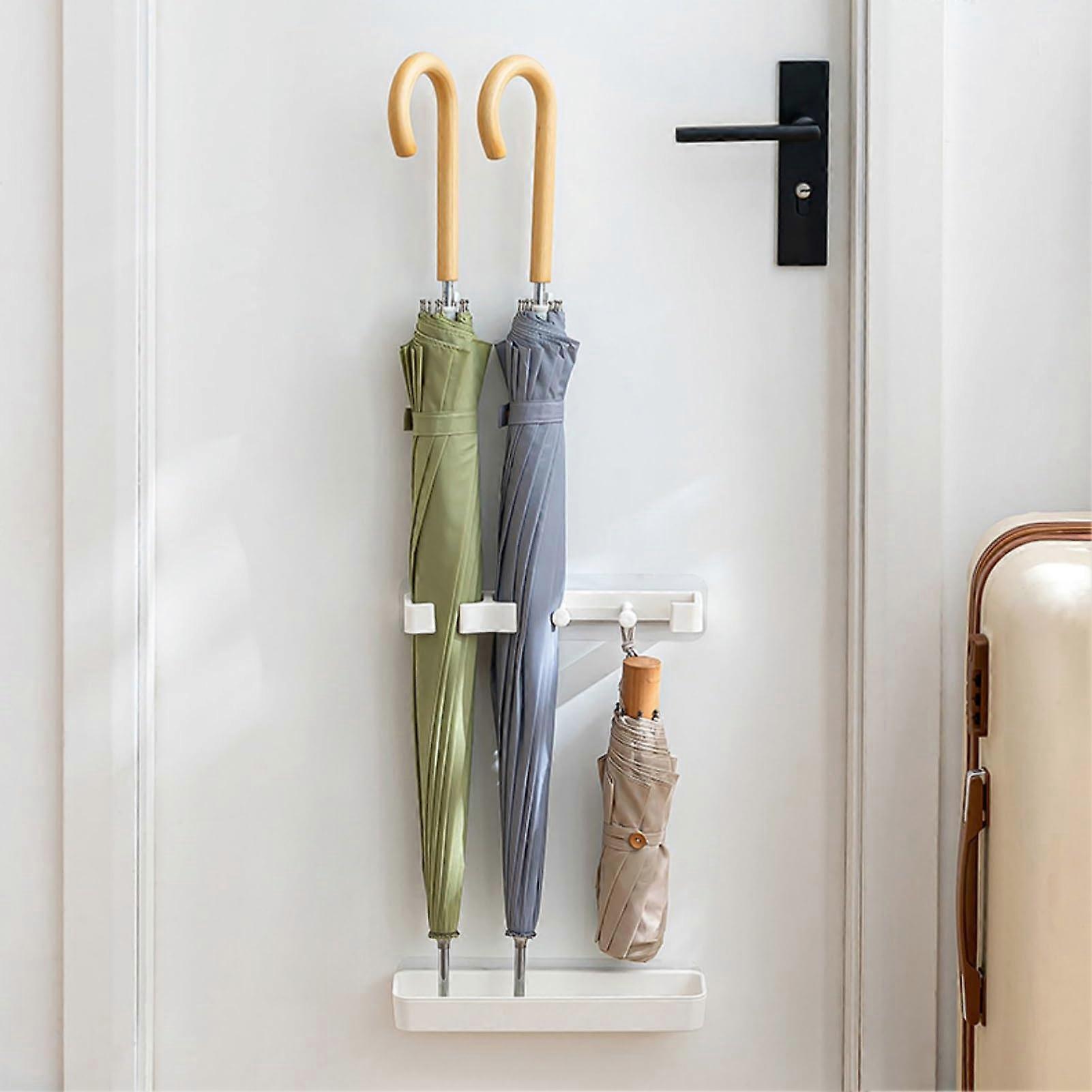 Wall Mounted Umbrella Stand with Adjustable Height, Plastic Rack Bin with 2 Hooks, Punch Space Saving White Organizer