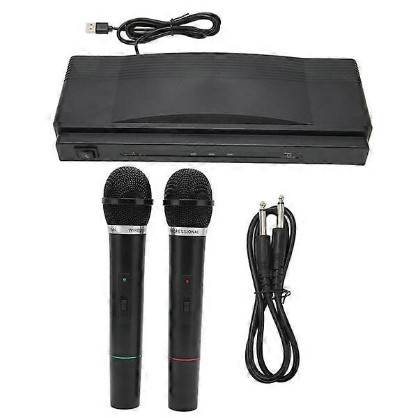 ①. Item Type: Wireless Microphone ②. Material: ABS ③. Microphone: Head Type: Moving Coil Type Head; Frequency Response: 100Hz to 12KHz; Usage Range: 10m / 10.9yd; Microphone Battery Specifications: 2 x 9V Batteries (Not Included) ④. Receiver: FM Type: 2.4G; Frequency Response: 100Hz to 12KHz; Usage Range: 10m / 10.9yd ⑤. Package List: 2x Microphone, 1 x Receiver, 1x Audio Cable, 1 x User Manual ⑥. The wireless microphone has a 1 for 2 design, one receiver supports two microphones, ergonomic design, convenient to use. ⑦. The handheld wireless microphone adopts V-band anti-interference frequency. ⑧. The handheld microphone is suitable for karaoke, home entertainment, outdoor singing, meeting host use. ⑨. The microphone receiver uses USB charging, and can be used for 6 hours after a full charge. ⑩. The dynamic karaoke microphone is in ideal condition for an effective reception distance of up to 10 meters.