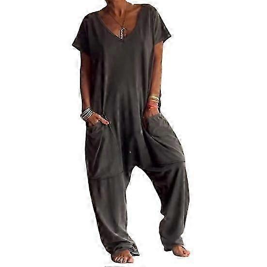 Yousheng Women Jumpsuit V Neck Short Sleeve Deep Crotch Loose Solid Color Big Pockets Full Length Casual Daily Wear Jumpsuit
